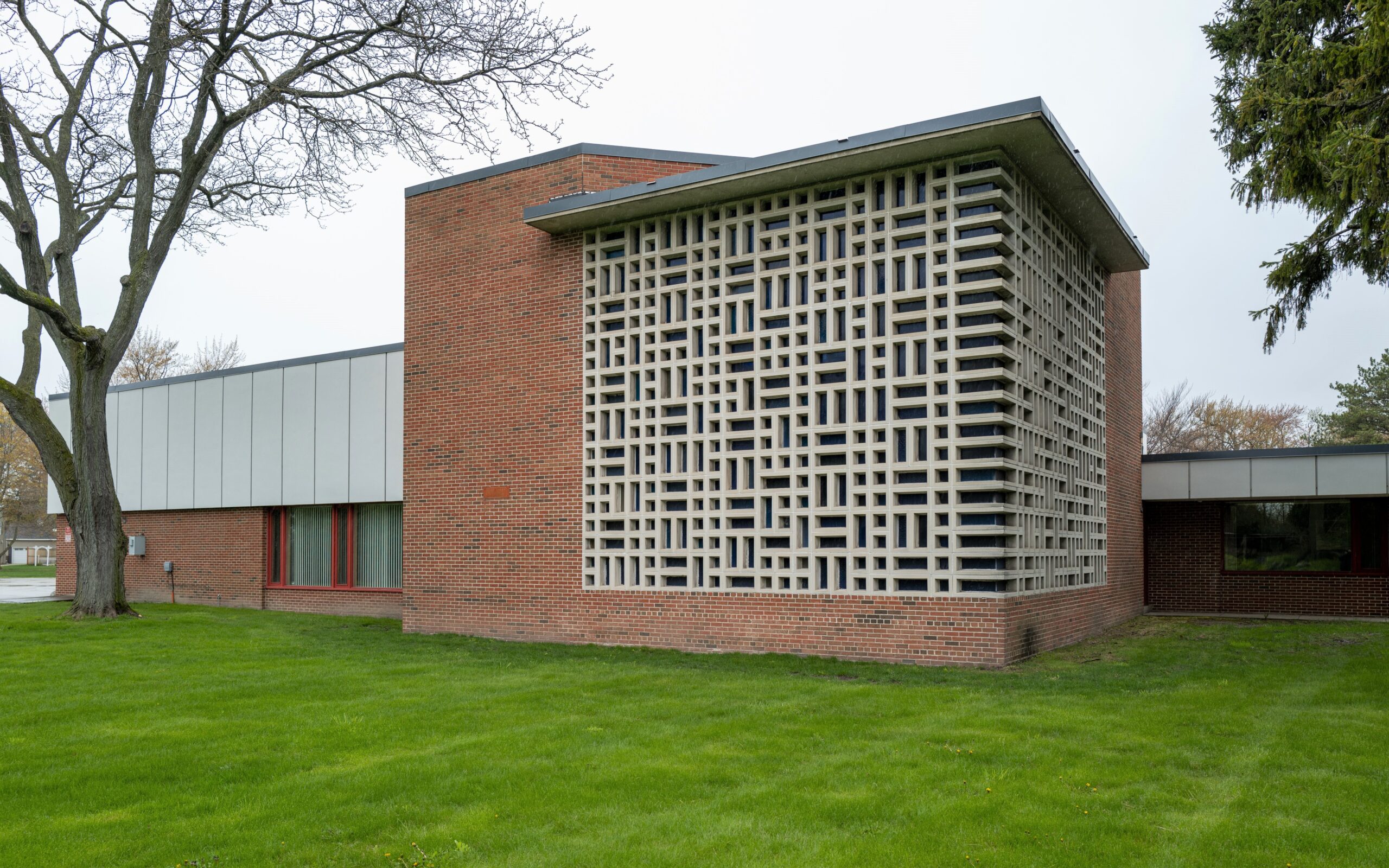 Specifications were finalized and the project went out for bids in 1959. Consolidated Construction Company of Bay City was selected as general contractor for its bid of $178,297, excluding separate contracts for electrical, mechanical and other trades. The building is set back from the street and is situated on the site diagonally, with its corners corresponding to the general directions of the compass. The brick exterior is topped by a two-level flat roof with projecting stucco friezes.