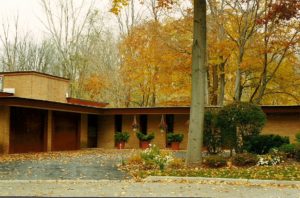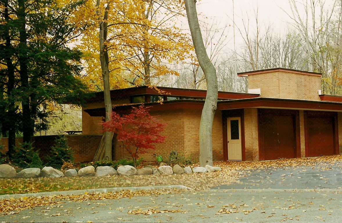 The second was designed in 1959-60 for Dr. Lionel Davis, a prominent Mt. Pleasant physician. Situated on a heavily-wooded lot on the Chippewa River, the 5,500 square foot one-story home has a flat roof, broad overhanging eaves, wood fascia and a tan brick exterior. The plane of the roofline is broken by a massive chimney with narrow clerestory windows on either side.